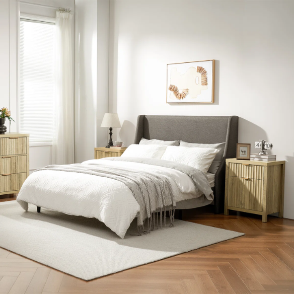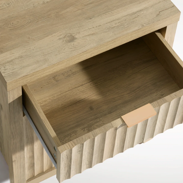 Upgrade your bedroom with this 2-piece nightstand set finished in a warm and inviting Sand Oak. Showcasing fluted-patterned drawer fronts and a natural wood grain finish, these nightstands bring a textured, organic charm to any space while blending seamlessly with modern farmhouse, coastal, or minimalist interiors.