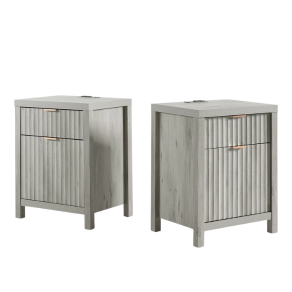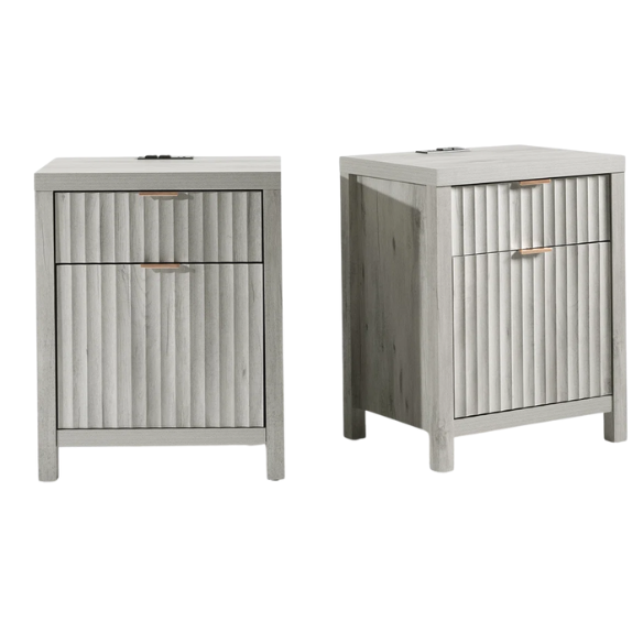 Refresh your bedroom with the clean sophistication of this 2-piece nightstand set in Light Grey. Designed with fluted drawer fronts and a natural wood grain look, these nightstands balance modern elegance with everyday practicality. The versatile finish makes them a perfect fit for farmhouse, minimalist, or coastal-inspired spaces.