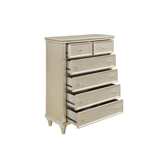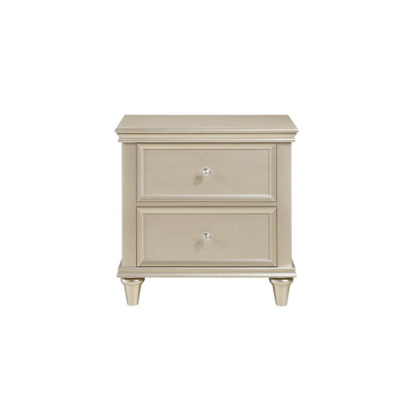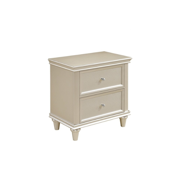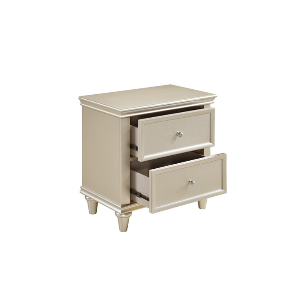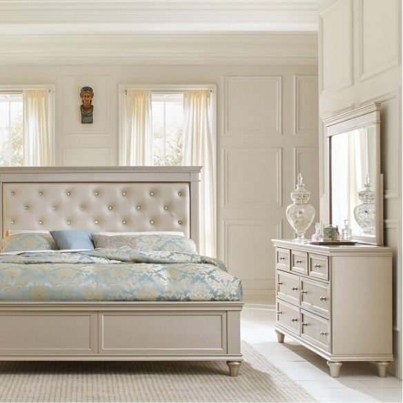 Elevate your bedroom with the refined elegance of this 3-piece Queen Bedroom Set, where traditional charm meets modern sophistication. The centerpiece of the collection is the bed, featuring a pearlized, button-tufted faux leather headboard insert that instantly draws the eye. Framed in a lustrous silver finish with embossed textural panels, it creates a striking balance of glamour and timeless design.