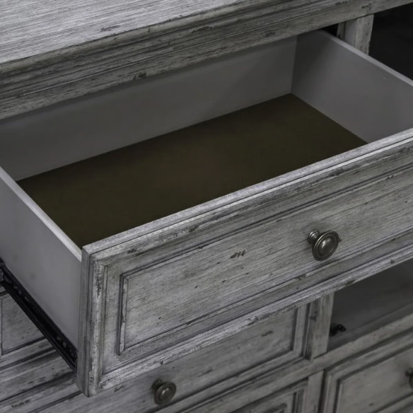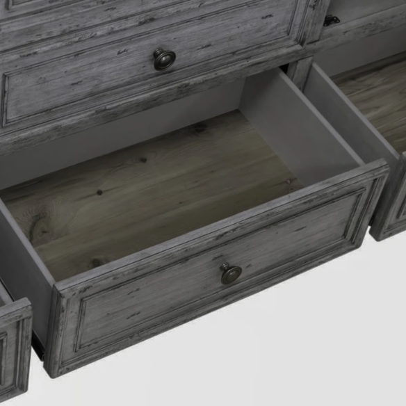 Constructed from solid rubberwood and premium wood products, this set is finished in a versatile weathered grey tone with purposeful distressing, highlighting natural wood scoring and rub-through for rustic charm. Architectural elements such as graduated bead molding, square pilasters, block feet, and heavy crown molding add grandeur and character. The antique pewter hardware complements the grey finish, while beveled glass on the mirror reflects both light and elegance.
