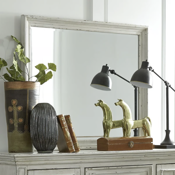 Crafted from solid rubberwood and premium wood products, each piece is finished in a distressed farmhouse white tone with purposeful wood scoring and rub-through, giving it an authentic, timeworn character. Architectural details such as graduated bead molding, square pilasters, block feet, and heavy crown molding add a grand, heirloom-inspired appeal. Paired with antique pewter hardware and a beveled-edge mirror, the look is both rustic and refined.