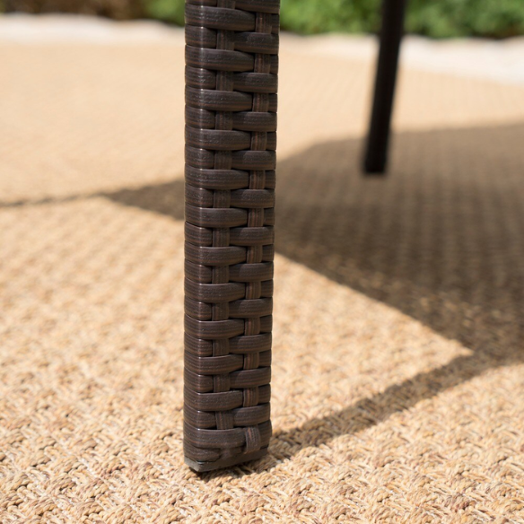 This versatile dining set offers the perfect balance of style and practicality. The wicker weave and warm brown finish add texture and elegance, while the cushions provide comfort for long dinners or relaxed conversations. With its umbrella-ready design and durable construction, this set is built for seasons of enjoyment.