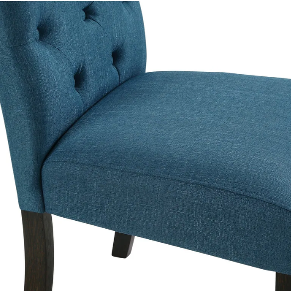 Paired with six upholstered armless chairs, this set offers style and comfort in equal measure. Each chair features a tall, supportive backrest and cushioned seat wrapped in performance-grade fabric available in striking blue, soft grey, rich purple, or warm tan. The vibrant blue option makes a bold statement, creating a beautiful contrast against the table’s dark finish.