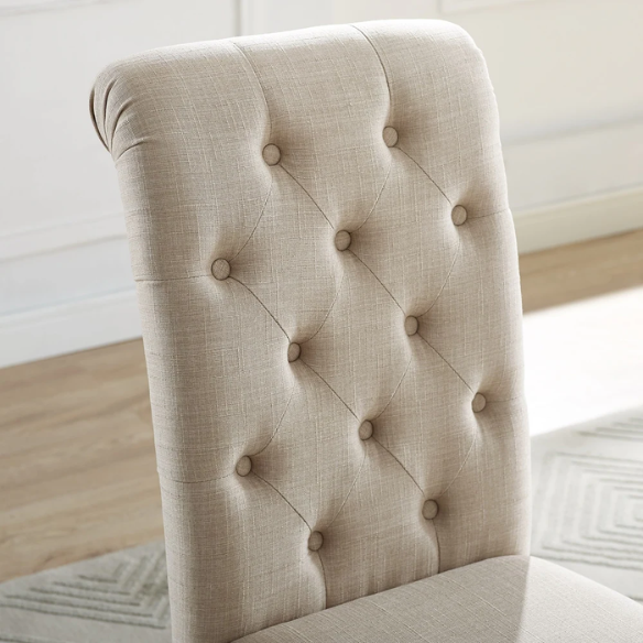 Six coordinating chairs complete the set, each designed with a tall, supportive back and cushioned seat for superior comfort. Upholstered in a warm tan performance fabric, the chairs create a welcoming, neutral palette that pairs perfectly with the table’s bold black finish. Ideal for family meals or gatherings, this set comfortably accommodates six diners while offering durability and timeless style.