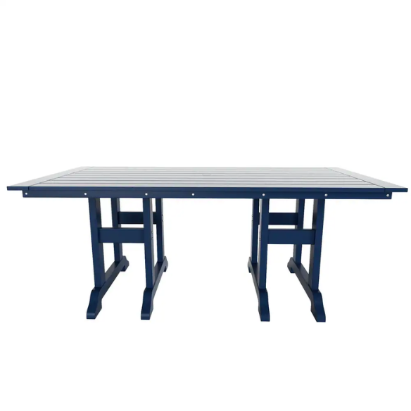 Bring refined style and lasting comfort to your outdoor gatherings with this elegant 7-piece navy blue outdoor dining set. Crafted from eco-friendly, weather- and UV-resistant materials, this set combines durability with timeless sophistication. The rectangular dining table provides ample space for meals and conversation, while the six contoured dining chairs feature curved backs, waterfall fronts, and wide arms for relaxed comfort. Perfect for patios, decks, or poolside spaces, this navy blue dining set transforms your backyard into a stylish retreat ideal for entertaining or everyday dining.