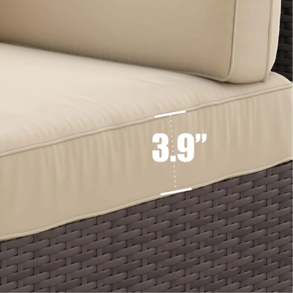Comfortable Beige Cushions: 3.9" thick cushions made of solution-dyed polyester, water-resistant, and filled with premium foam for all-day comfort. Removable covers with zippers allow easy cleaning.