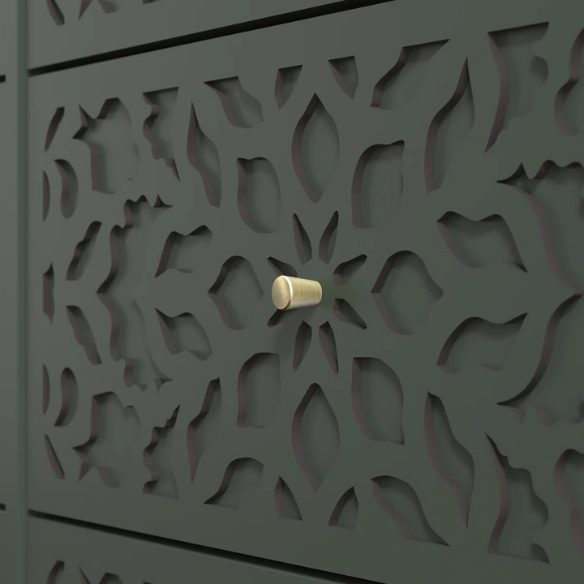 Intricate laser-cut floral/medallion drawer fronts for a unique boho touch