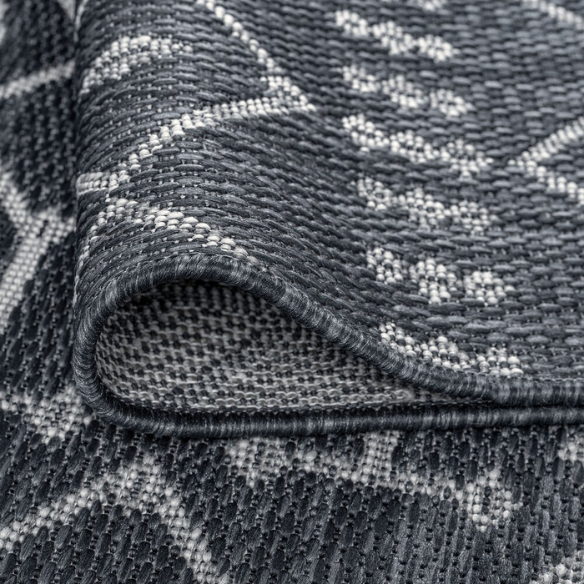 Elevate your indoor or outdoor space with the sleek sophistication of this charcoal grey and light grey geometric area rug. Featuring a modern boho-inspired design with repeating Moroccan-style patterns, this versatile rug brings understated elegance and structure to porches, patios, sunrooms, and indoor living areas alike.