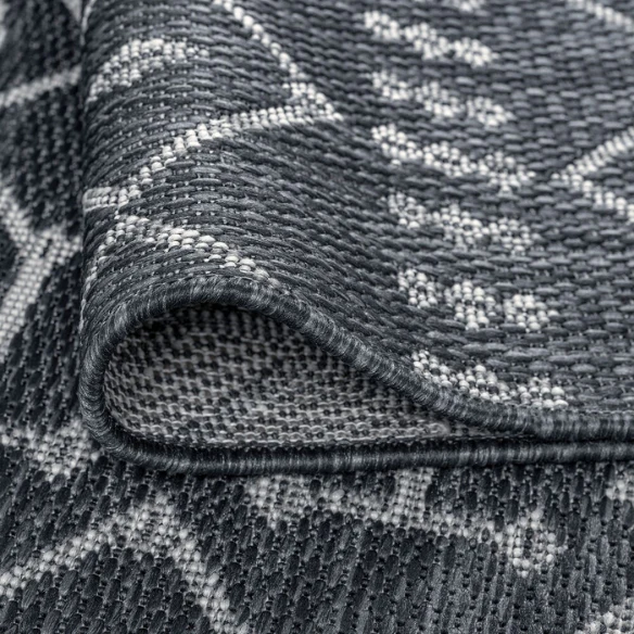 Elevate your indoor or outdoor space with the sleek sophistication of this round charcoal grey and light grey geometric area rug. Featuring a modern boho-inspired design with repeating Moroccan-style patterns, this versatile piece brings understated elegance and structure to porches, patios, sunrooms, and indoor living areas alike.