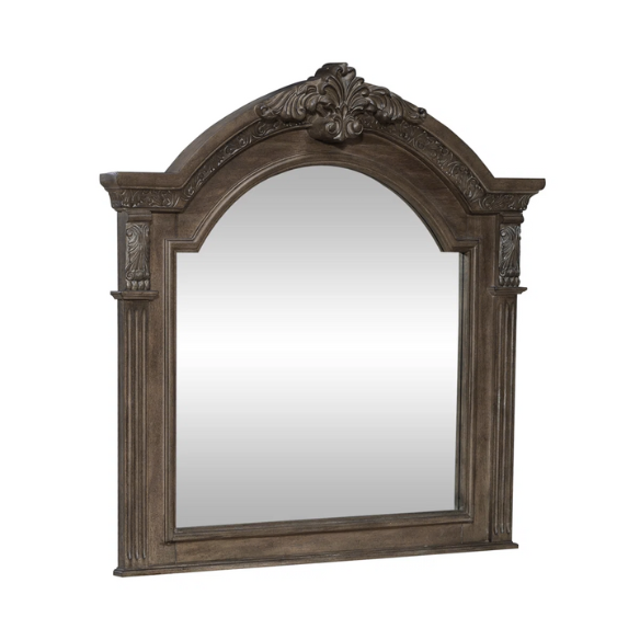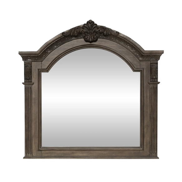 Mirror Details: 1” beveled edge and carved crown with acanthus accents.