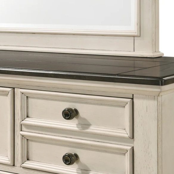 The warm cream and brown two-tone finish creates a soothing, inviting atmosphere, while the intricately crafted wood panels add depth, texture, and a luxurious touch. Perfectly blending comfort with style, this set serves as a lasting centerpiece for your bedroom, complementing both modern and transitional décor.