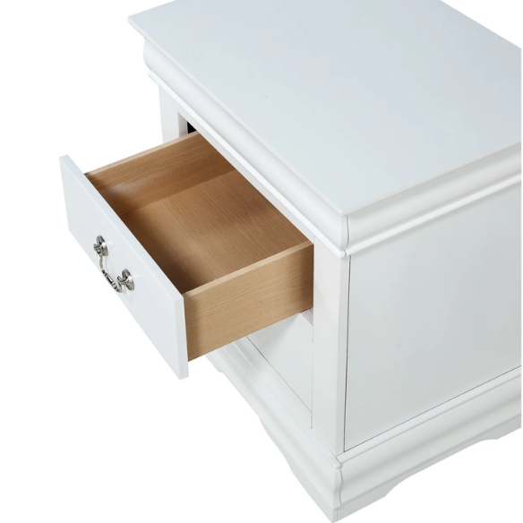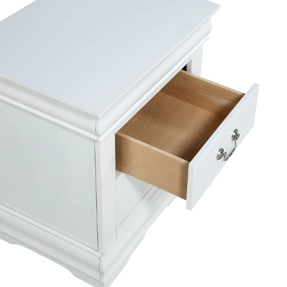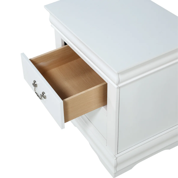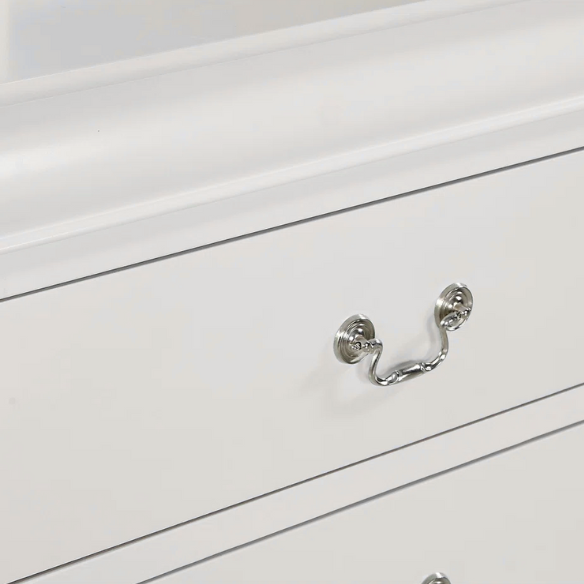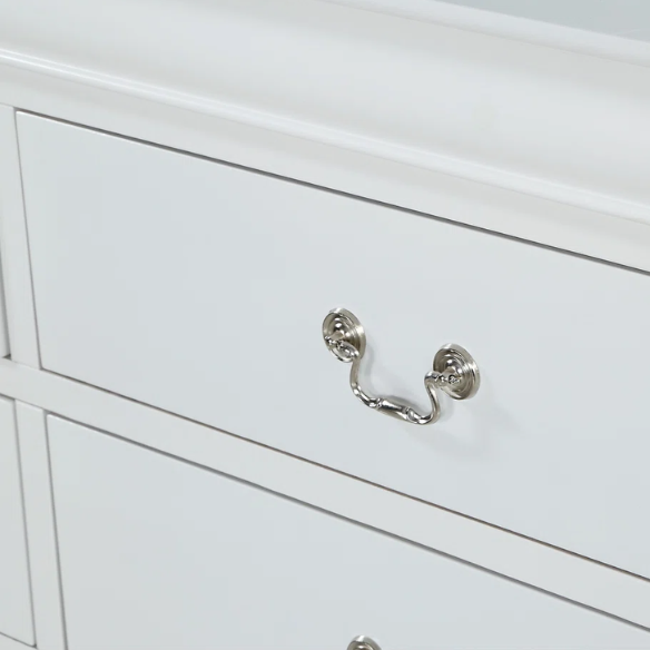Elevate your bedroom with the timeless elegance of this White Full-Size Sleigh Bedroom Set, a complete 5-piece ensemble designed for both beauty and functionality. With its classic Louis-inspired silhouette updated in a crisp modern white finish, this set offers a versatile style that complements traditional, transitional, and contemporary décors alike.