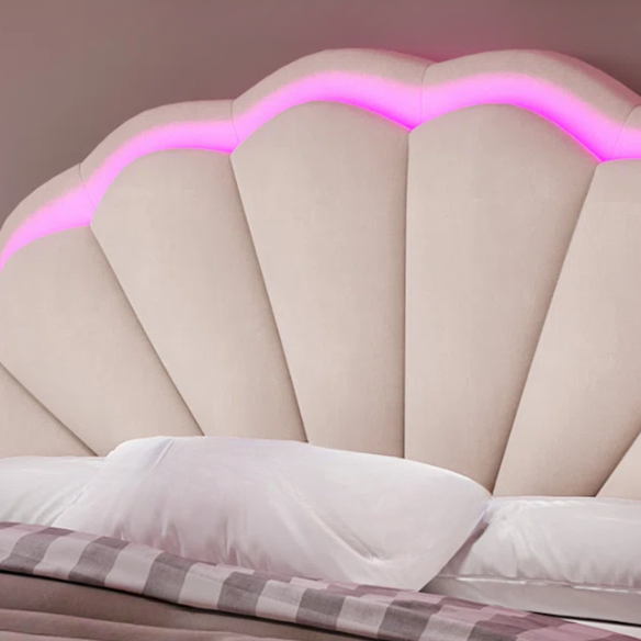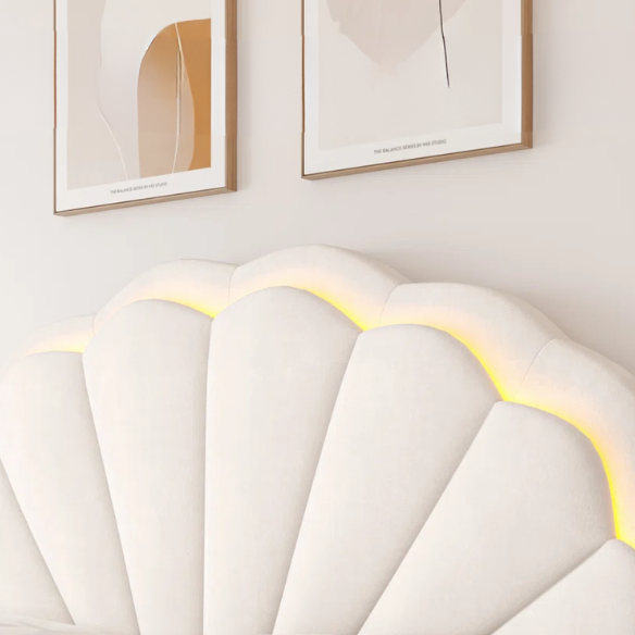 Create a serene and sophisticated bedroom atmosphere with this white velvet platform bed that blends elegant design with smart, space-saving features. The scalloped, flower-inspired headboard makes a graceful focal point, while the clean white hue brightens any room with a fresh, modern feel.