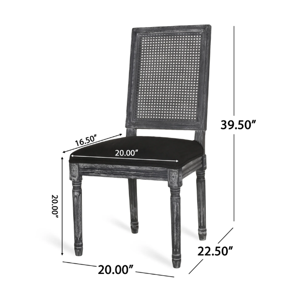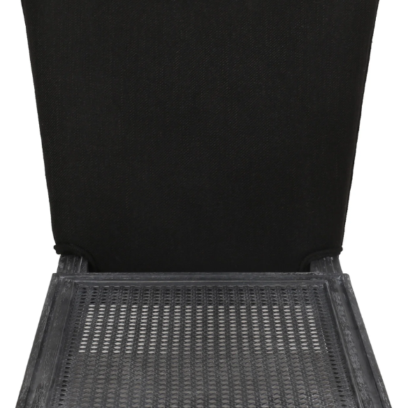 Bring elegance and warmth to your dining space with this beautifully crafted set of rustic farmhouse dining chairs, now in a bold dark grey wood finish with sleek black upholstered cushions. Inspired by timeless French country design, these chairs feature a handwoven cane backrest, gracefully fluted legs, and artisan-level woodwork that merges traditional charm with modern sophistication.