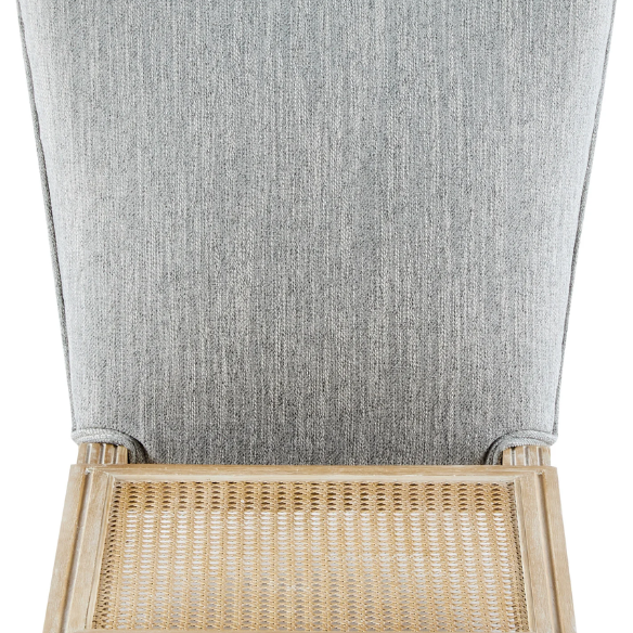 Bring charm and sophistication to your dining area with this beautifully crafted set of rustic farmhouse dining chairs. Showcasing a timeless neutral wood finish and soft grey upholstered cushions, these chairs blend French country elegance with modern simplicity. The artisan-crafted frame features hand-carved detailing, a handwoven cane backrest, and gracefully fluted legs for a high-end yet approachable aesthetic.