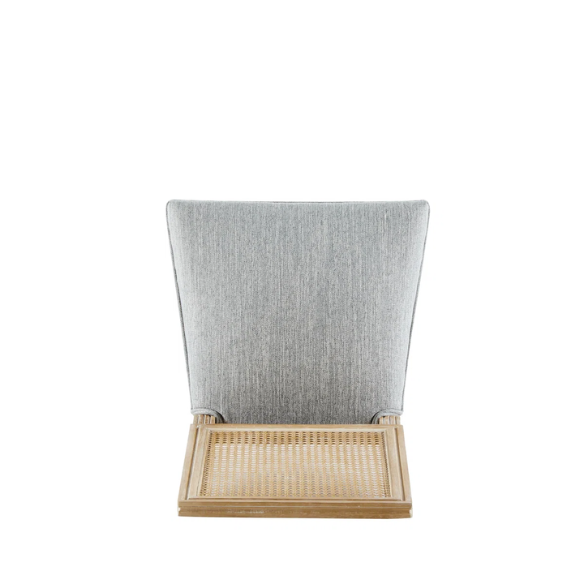 Materials: Solid rubberwood frame, handwoven cane back, grey polyester upholstered cushion