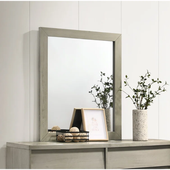 The platform-style bed features a sturdy slat system and center support legs, eliminating the need for a box spring while ensuring lasting durability. Coordinating pieces include a spacious dresser with mirror, a functional nightstand, and a matching chest, all crafted with dovetail joinery and roller glides for smooth drawer operation.