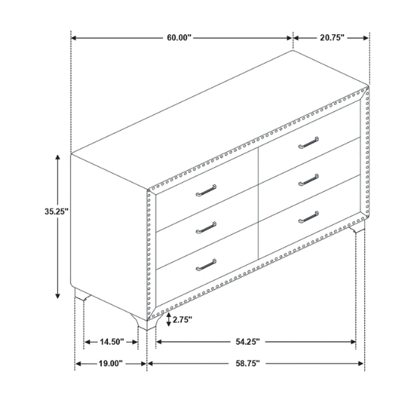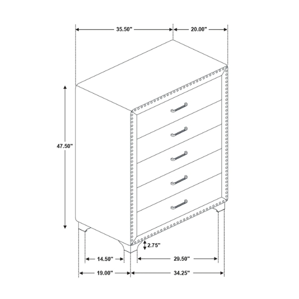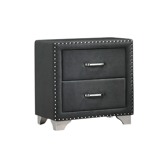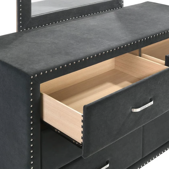 The bed features deep button tufting, elegant nailhead trim, and plush padding for a truly grand centerpiece. Coordinating storage pieces—including a dresser, mirror, chest, and nightstand—are all wrapped in soft velvet, trimmed with chrome studs, and adorned with dazzling crystal-accented handles. Chrome metal feet tie the look together, giving your space a refined yet contemporary finish.