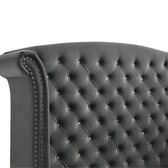 Dramatic Wingback Headboard – Oversized design with deep button tufting, nailhead trim, and plush shaping.