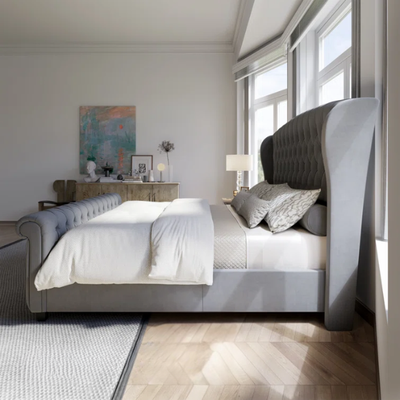 This grey velvet sleigh bed combines old-world elegance with modern comfort. The soft, shimmering fabric and sculpted profile make it a standout statement piece, while its supportive frame and slat foundation ensure reliable performance. It’s the perfect choice for anyone who loves comfort with a touch of grandeur.
