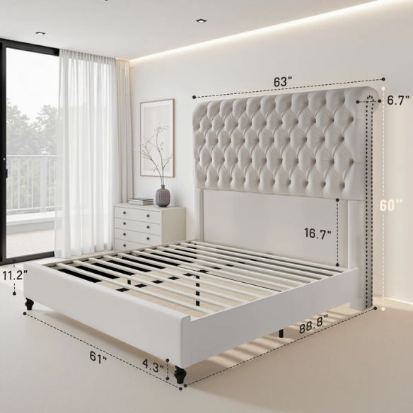Diamond Tufting & Pleated Accents: Adds dimension and style to the tall sleigh-style headboard