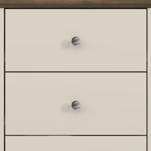 The combination of ivory drawers with a natural wood tone top creates a sophisticated, two-tone aesthetic. Sleek round metal knobs add a refined finishing touch, and a tip-over restraint device is included for added safety—ideal for homes with children or pets.