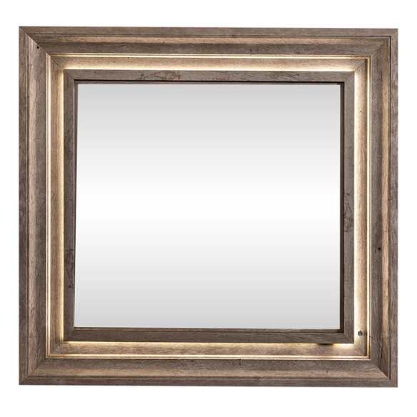 With today’s lifestyle in mind, the nightstand includes a built-in charging station featuring outlets and USB ports, making multi-device charging simple and convenient. The landscape mirror also includes inset LED lighting, mirroring the bed’s modern glow for a cohesive design.