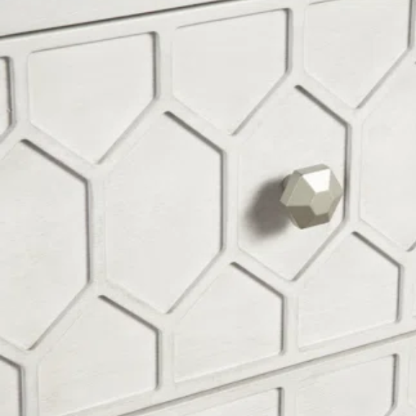 The centerpiece is a King bed with a striking honeycomb-patterned headboard, adding a modern touch to a timeless silhouette. A matching nightstand, dresser, chest, and dresser mirror complete the set, offering versatile storage for all your essentials. Each case piece features smooth metal hardware, dovetail drawers, and lined interiors for a polished finish.