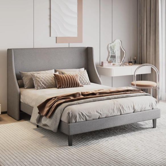 Light Grey Modern Wingback Upholstered Queen Platform Bed