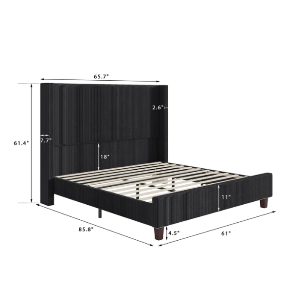 Bring timeless charm and cozy sophistication to your bedroom with the Black Ribbed Corduroy Wingback Queen Bed. Upholstered in luxuriously soft ribbed corduroy, this platform bed pairs classic texture with a sleek, contemporary silhouette. The standout winged headboard features vertical channel tufting for visual depth and added neck and back support, making it as functional as it is stylish.