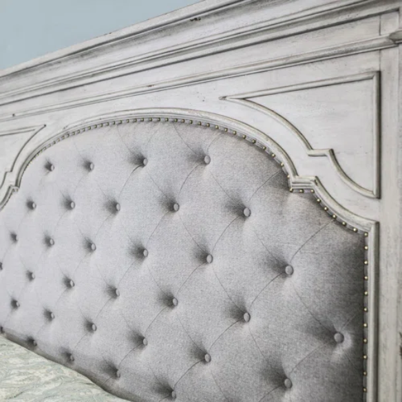 The king-size panel bed features a soft button-tufted headboard upholstered in durable polyester, with foam padding for comfort and nailhead trim for added sophistication. Detailed crown molding, a low footboard with vertical planked panels, and a rustic white distressed finish give the bed a refined yet relaxed farmhouse appeal.