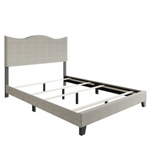Elevate your bedroom with the timeless sophistication of this Neutral Grey Fog camelback upholstered bed, featuring a gracefully arched headboard and refined nailhead trim. Wrapped in soft neutral grey fog polyester fabric and padded with plush foam, the headboard offers a cozy and supportive surface — perfect for nighttime reading or lounging.