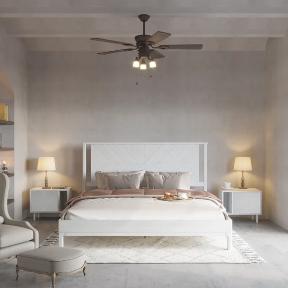 White Solid Wood King Bed with Geometric Herringbone Headboard