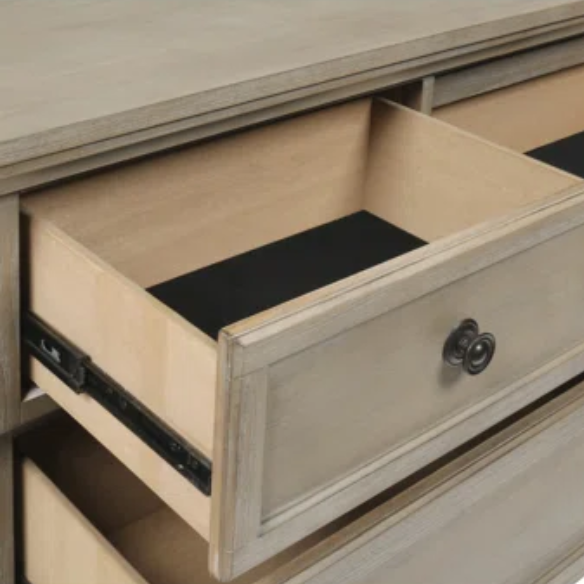 The accompanying storage pieces bring both beauty and function: the 9-drawer dresser offers generous wardrobe storage and is paired with a matching beveled mirror; the 5-drawer chest provides vertical storage without sacrificing floor space; and the two nightstands feature built-in USB ports for convenient charging, along with felt-lined drawers for delicate essentials. Antique-inspired metal hardware in a dark bronze finish completes the design with a refined touch.
