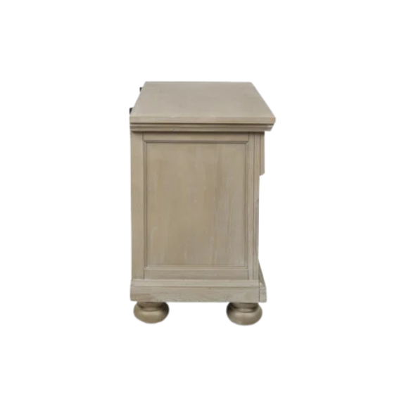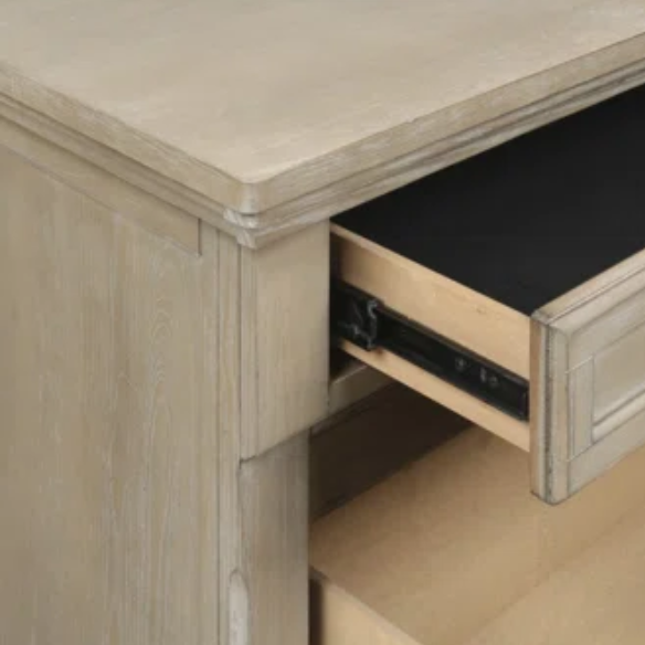 At the heart of the set is the King Sleigh Bed, designed with a gracefully curved paneled headboard and bun feet for a classic silhouette. The footboard includes two spacious storage drawers, ideal for storing linens, blankets, or seasonal clothing while keeping your space clutter-free. Sturdy wood slats are included, supporting your mattress and eliminating the need for a box spring.