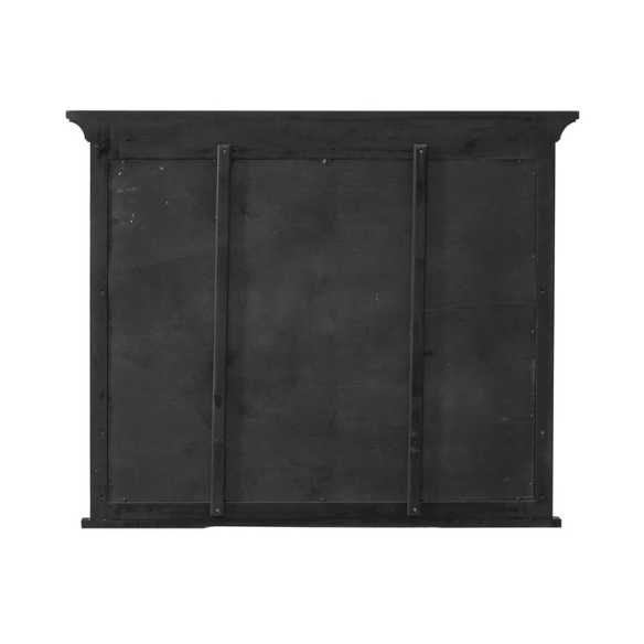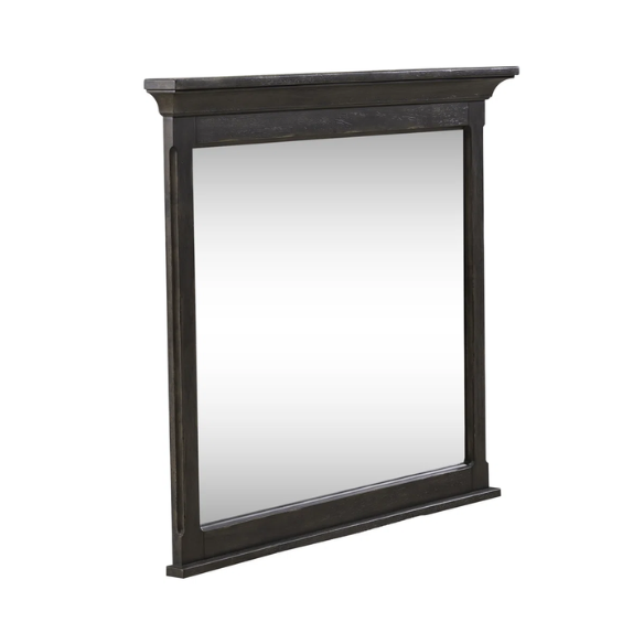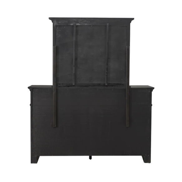Completing the set, the landscape mirror attaches securely to the dresser with bolt-on supports. It features heavy crown molding, chamfered edges, and a beveled edge for added brilliance, tying the entire ensemble together in a statement of rustic sophistication.