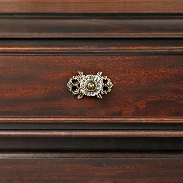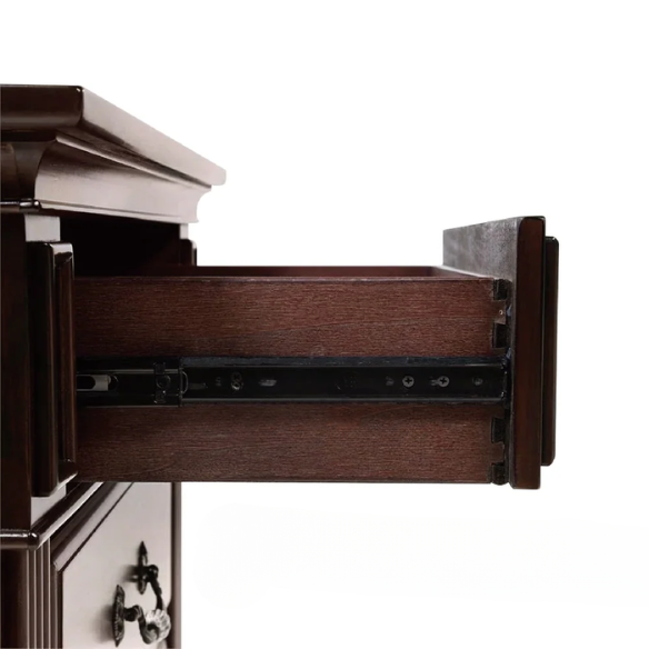 Both the three-drawer nightstand and six-drawer chest offer ample storage for your essentials, designed with English dovetail joinery, full-extension metal glides, and felt-lined top drawers for delicate items. Antique brass hardware with subtle acrylic accents adds a sophisticated touch, completing the elegant design.