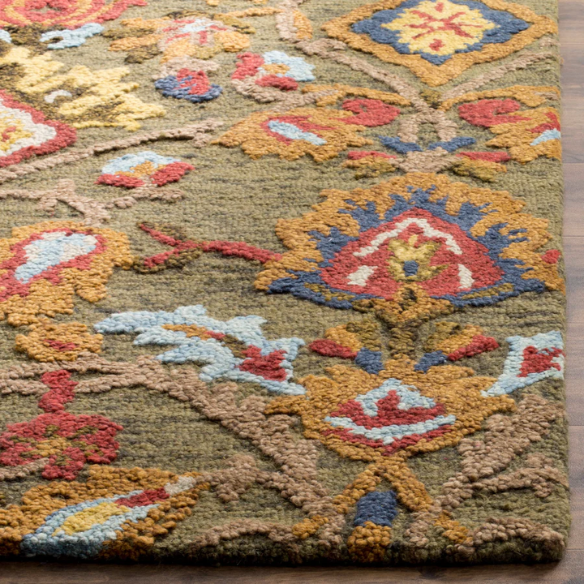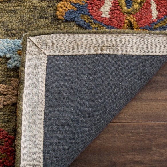 Bring timeless charm and vibrant color to your home with this hand-tufted wool area rug, masterfully designed to blend traditional elegance with modern versatility. Anchored by a rich moss green base, the rug showcases a stunning arrangement of floral and botanical accents in warm, earthy shades of red (including deep orange), yellow, blue, teal, light brown, light gray, and tan. The intricate patterning and layered tones create a visually captivating piece that instantly elevates any room.