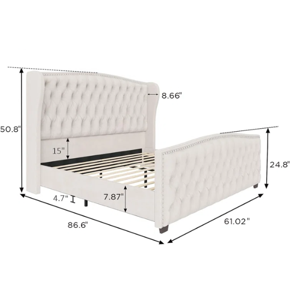 This glamorous upholstered bed is designed to turn heads and transform your bedroom into a high-style retreat. Featuring a grand camelback wingback headboard with deep diamond tufting, hand-applied nailhead trim, and plush cream velvet upholstery, it blends timeless sophistication with everyday functionality.